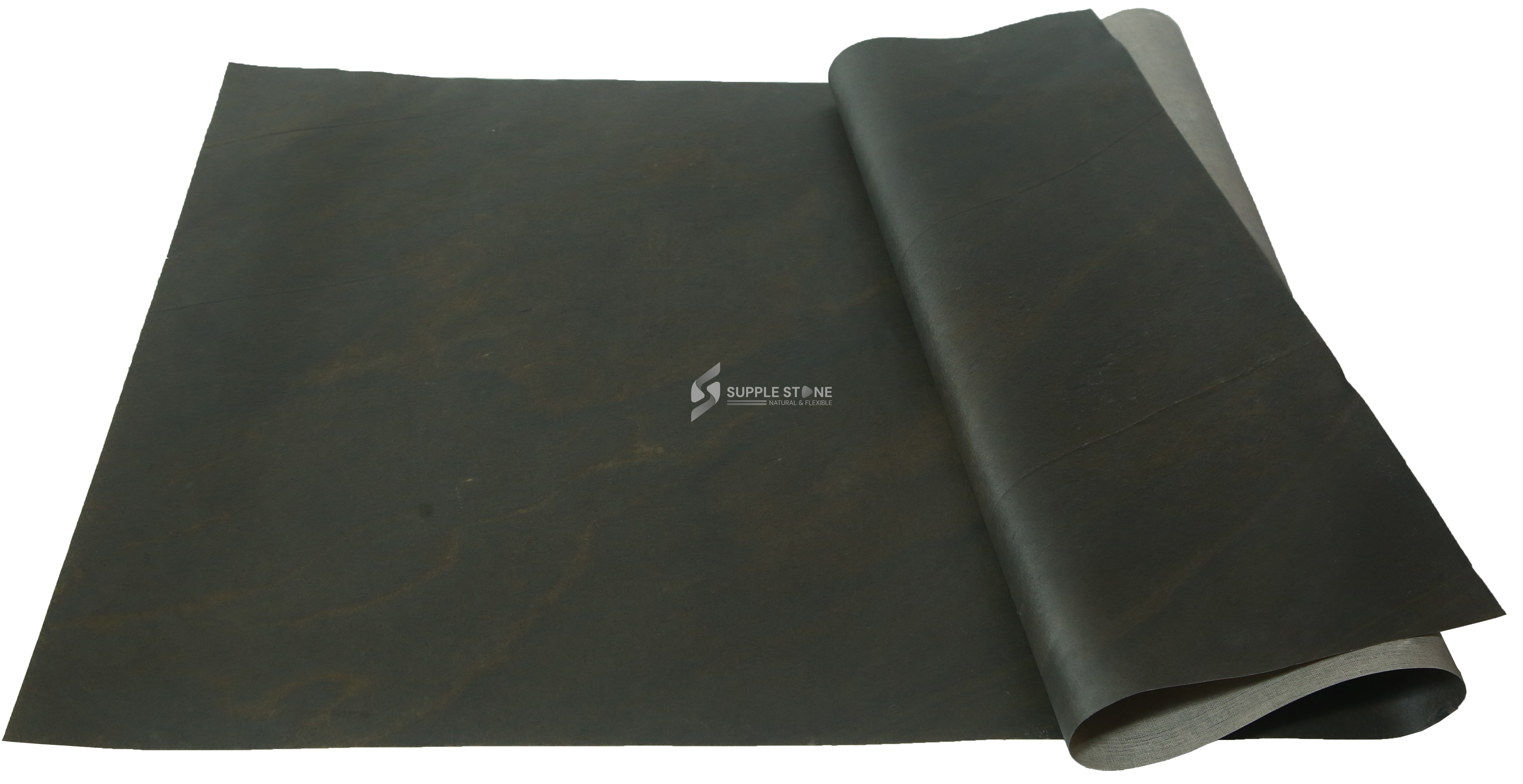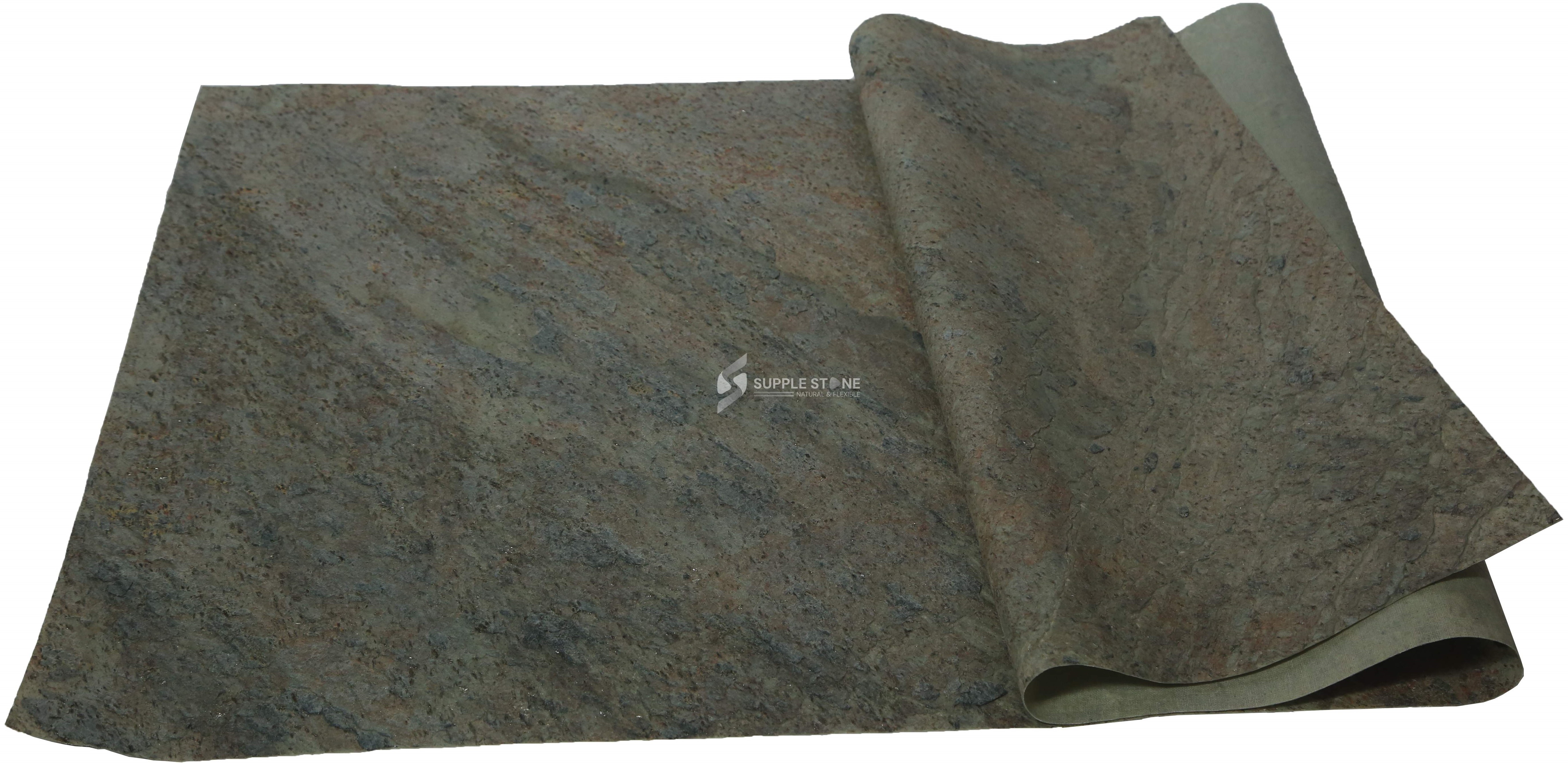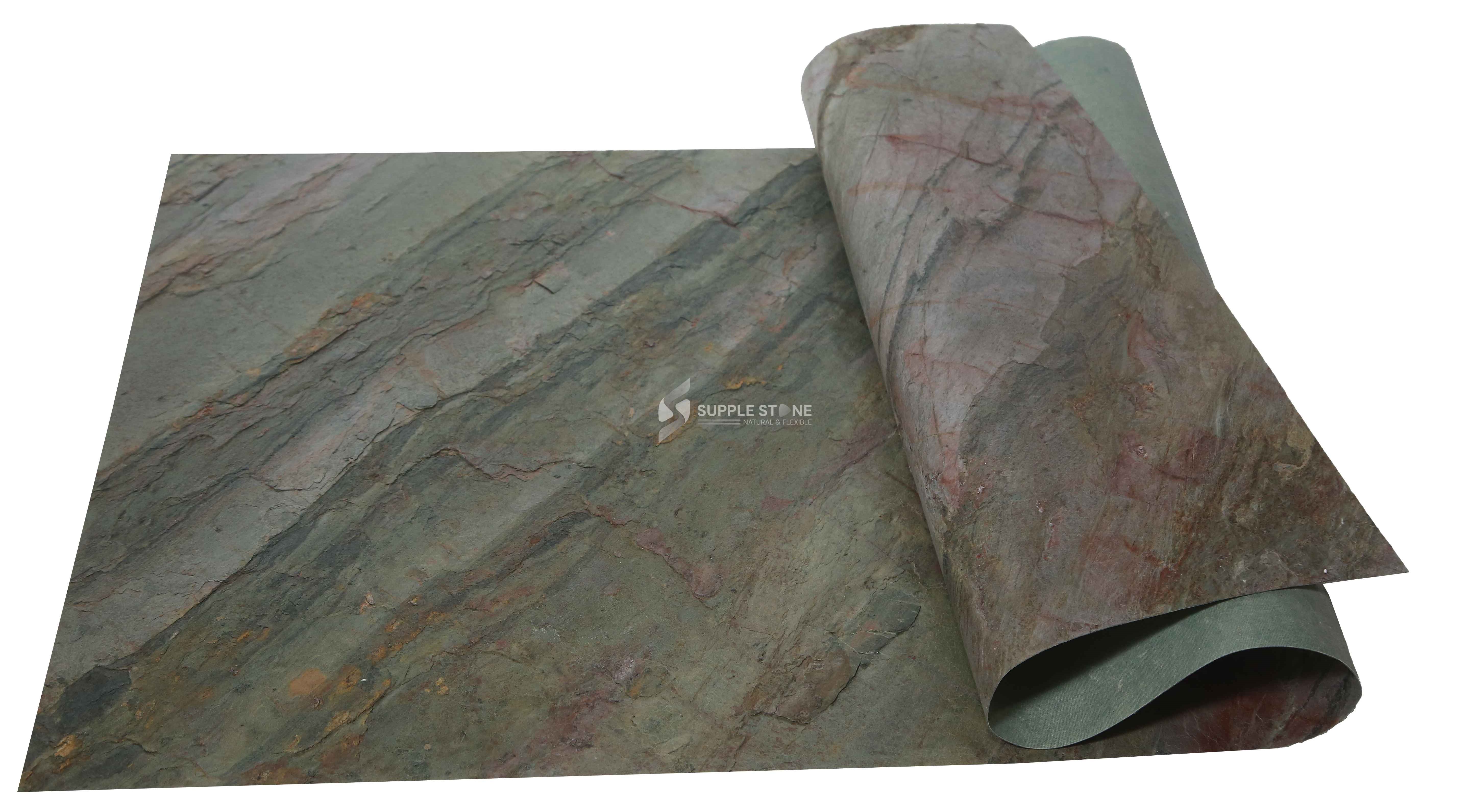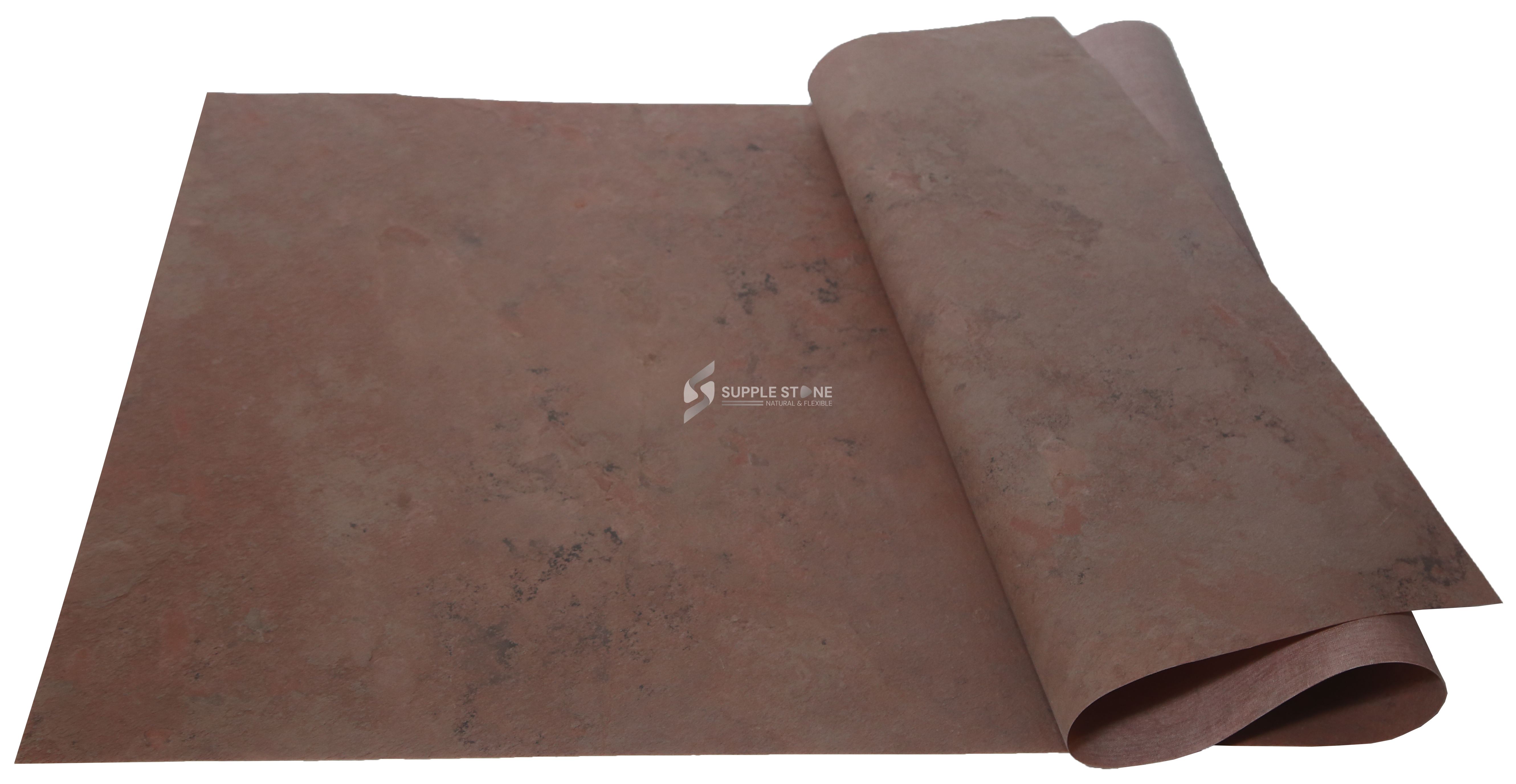 Burning Forest Copper features a vibrant red base with a shiny, high-quality finish, creating a warm and dynamic atmosphere. veneer sheet, made from layered stone, showcases natural variations like color differences, quartz veins, and slight chipping.