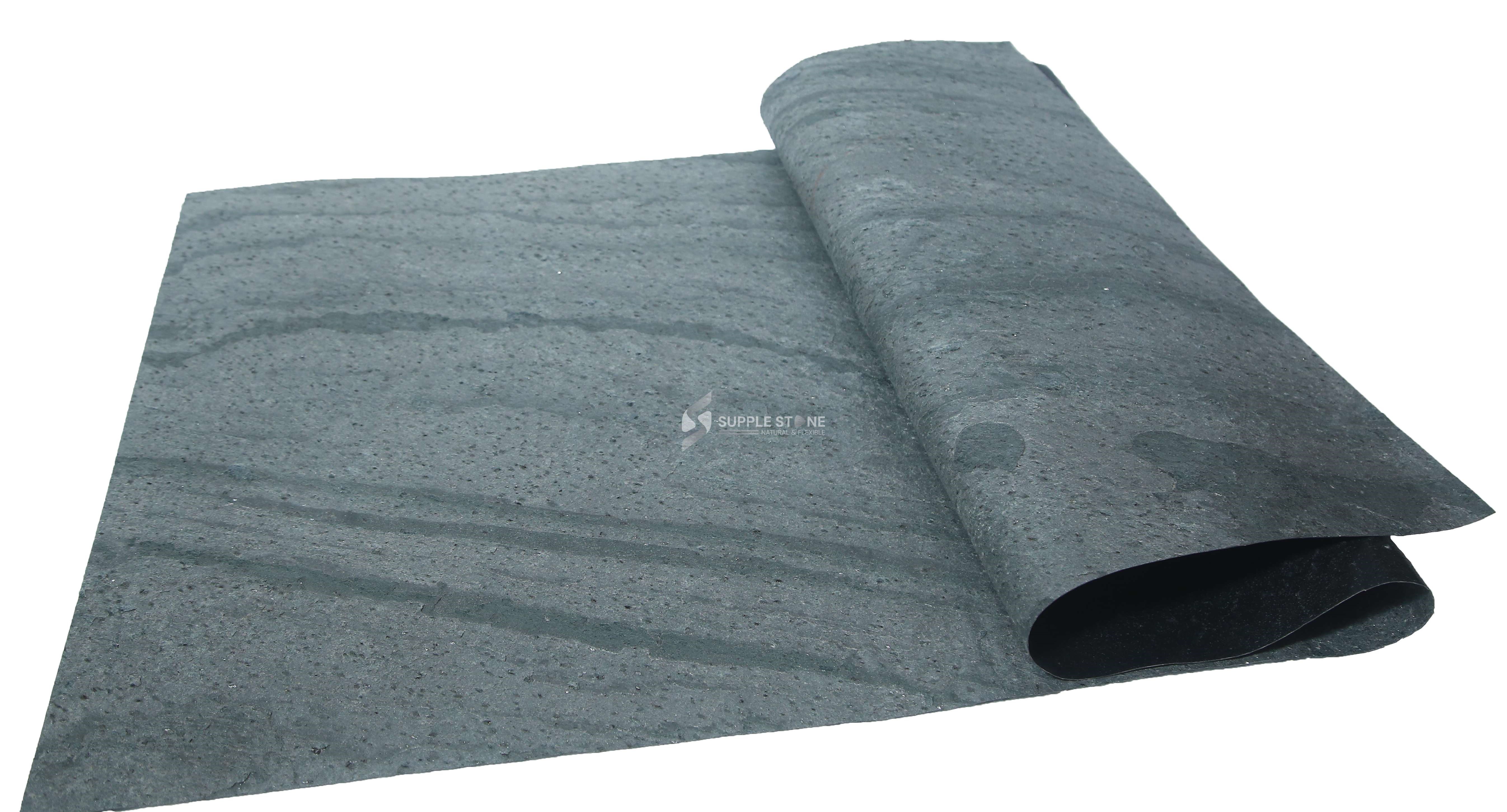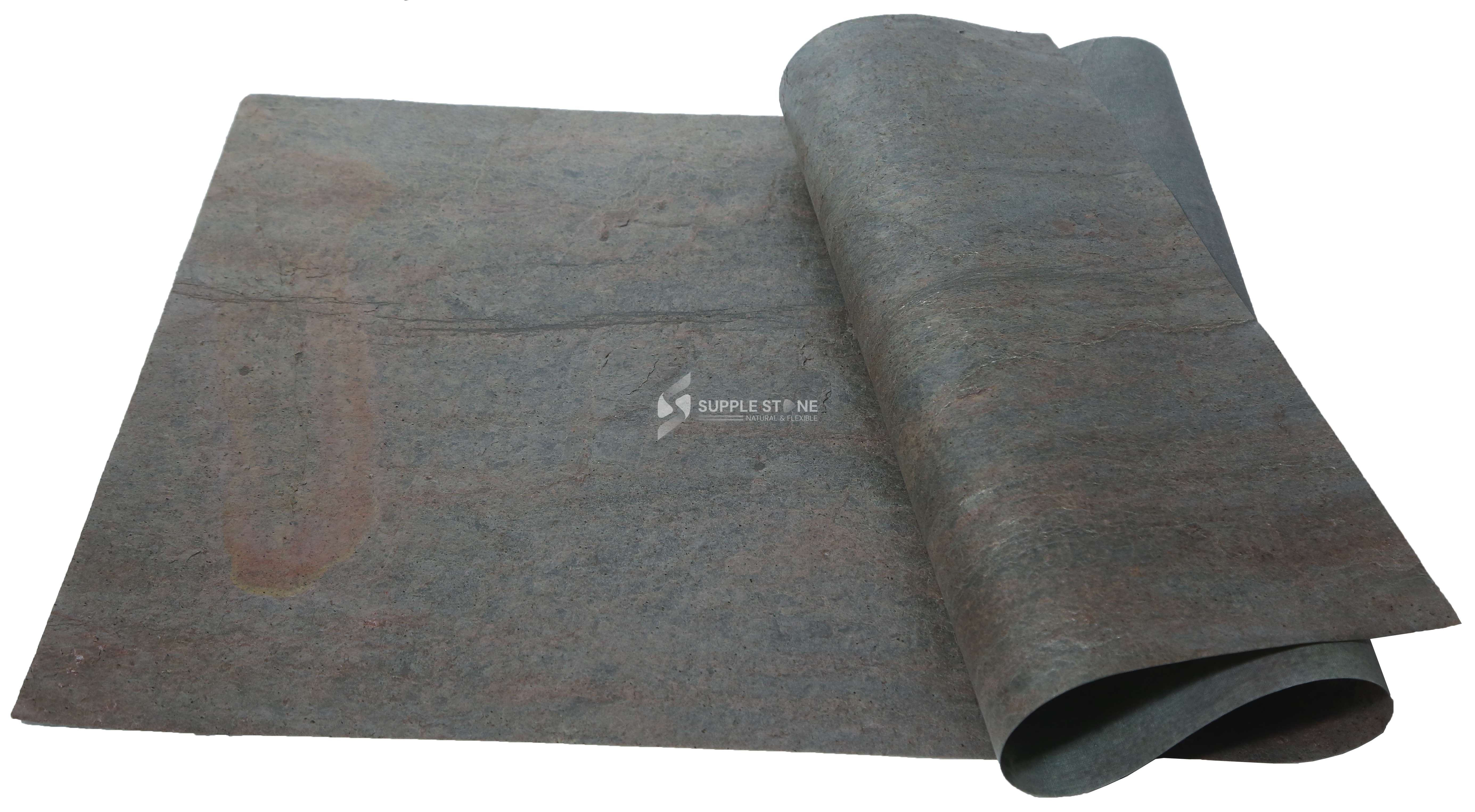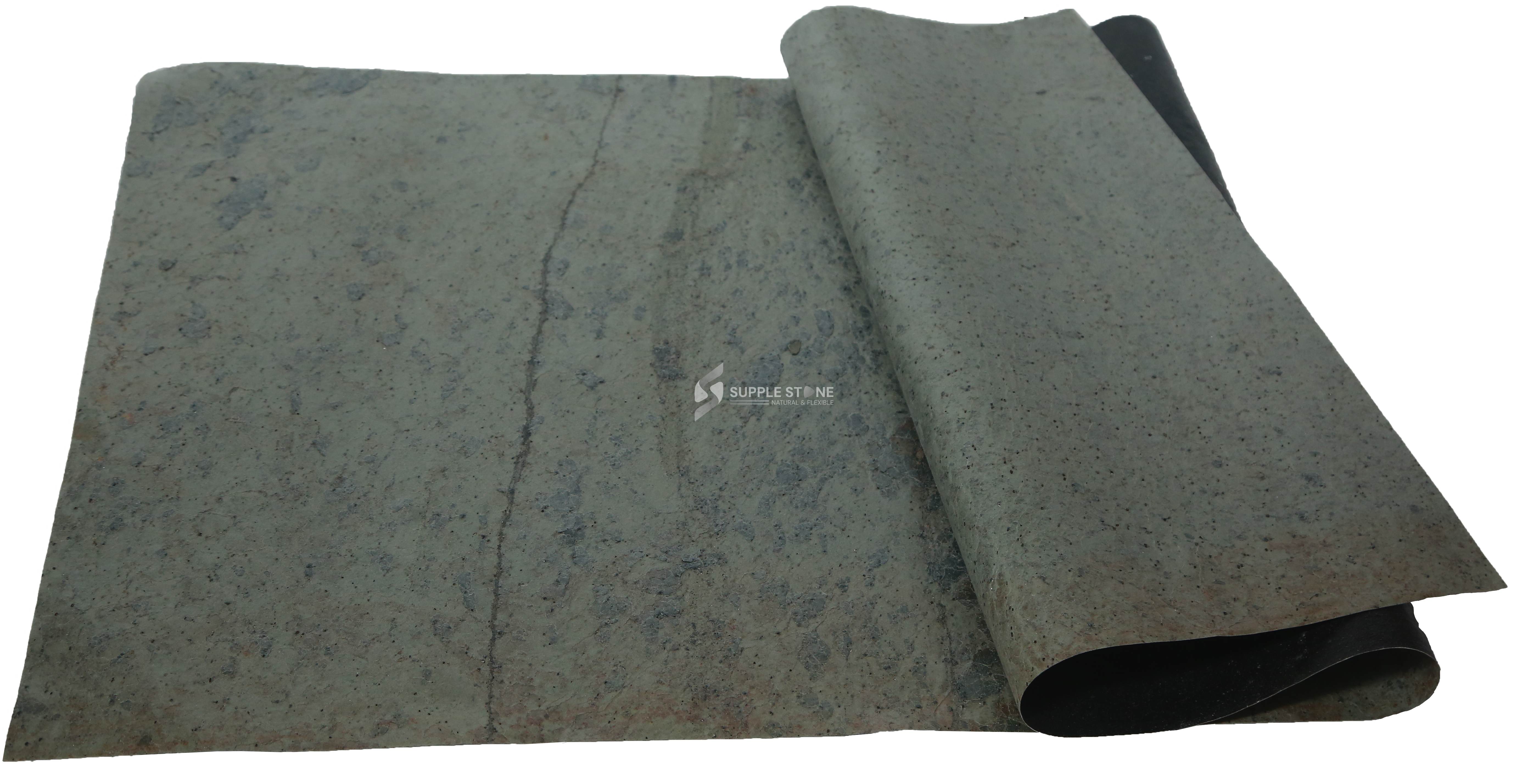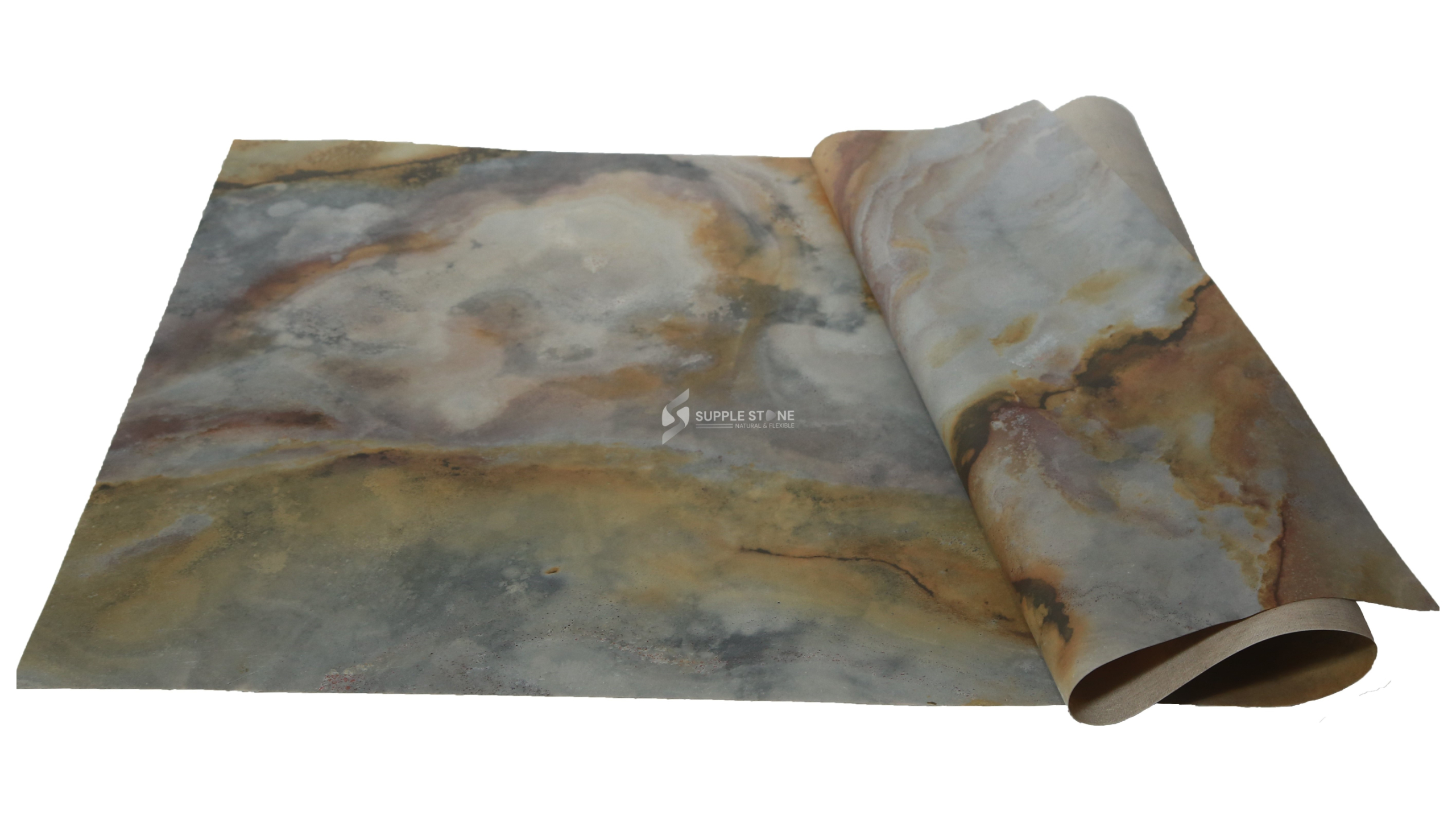 Burning Forest Copper features a vibrant red base with a shiny, high-quality finish, creating a warm and dynamic atmosphere. veneer sheet, made from layered stone, showcases natural variations like color differences, quartz veins, and slight chipping.